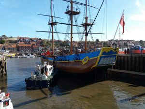 Captain Cook was 9 years in Whitby learning his trade and his ship “Endeavour” was a converted Whitby built collier. His first voyage to the Pacific was 250 years ago. A replica of the ship is alongside in the harbour.