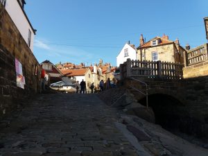 Our next stop was Robin Hood’s Bay which is situated between Whitby and Scarborough, a long awaited treat as we have heard so much about it. This is the most heavily visited spot on this stretch of coast and is made up of gorgeous narrow streets and pink tiled cottages toppling down the cliff-edge site. It is an old fishing village but, in the 18th century, it was reportedly the busiest smuggling community on the Yorkshire coast. It has a recorded history dating back to 1322-1346 when a letter from Louis Count of Flanders to Edward 111, pleaded for the return of his ship which was taken to “Robin Oode Bay” by the people of England. There are many other historic facts and tales relating to this village which makes it a most interesting place to visit. It is also very picturesque.