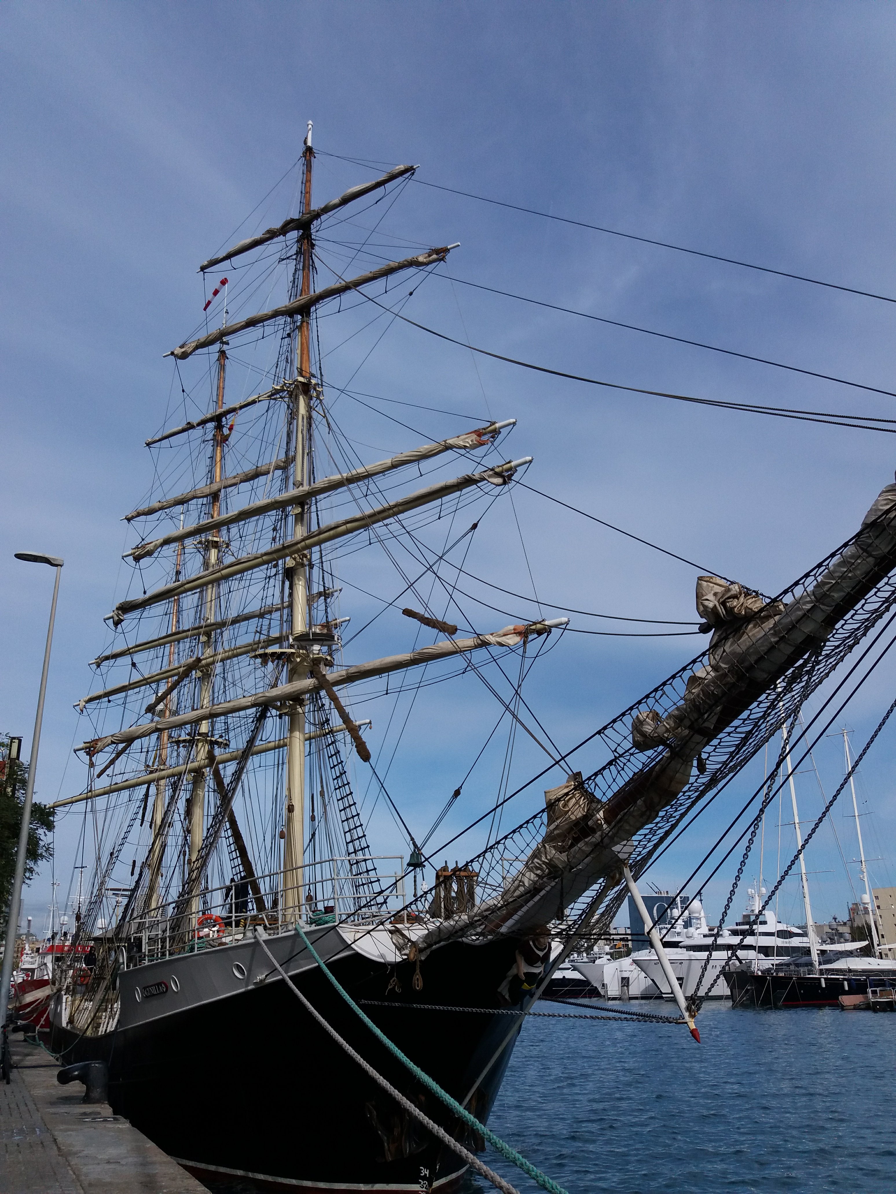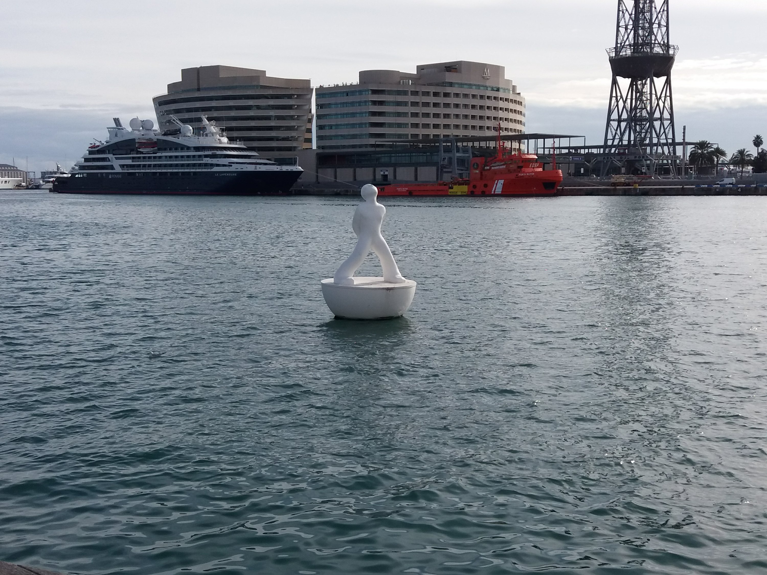 One of two floating statues looking up into the skyInformation about the floating statueThe old and the new in Barcelona marinaTall ship in Barcelona marinaLobster sculpture on the promenade